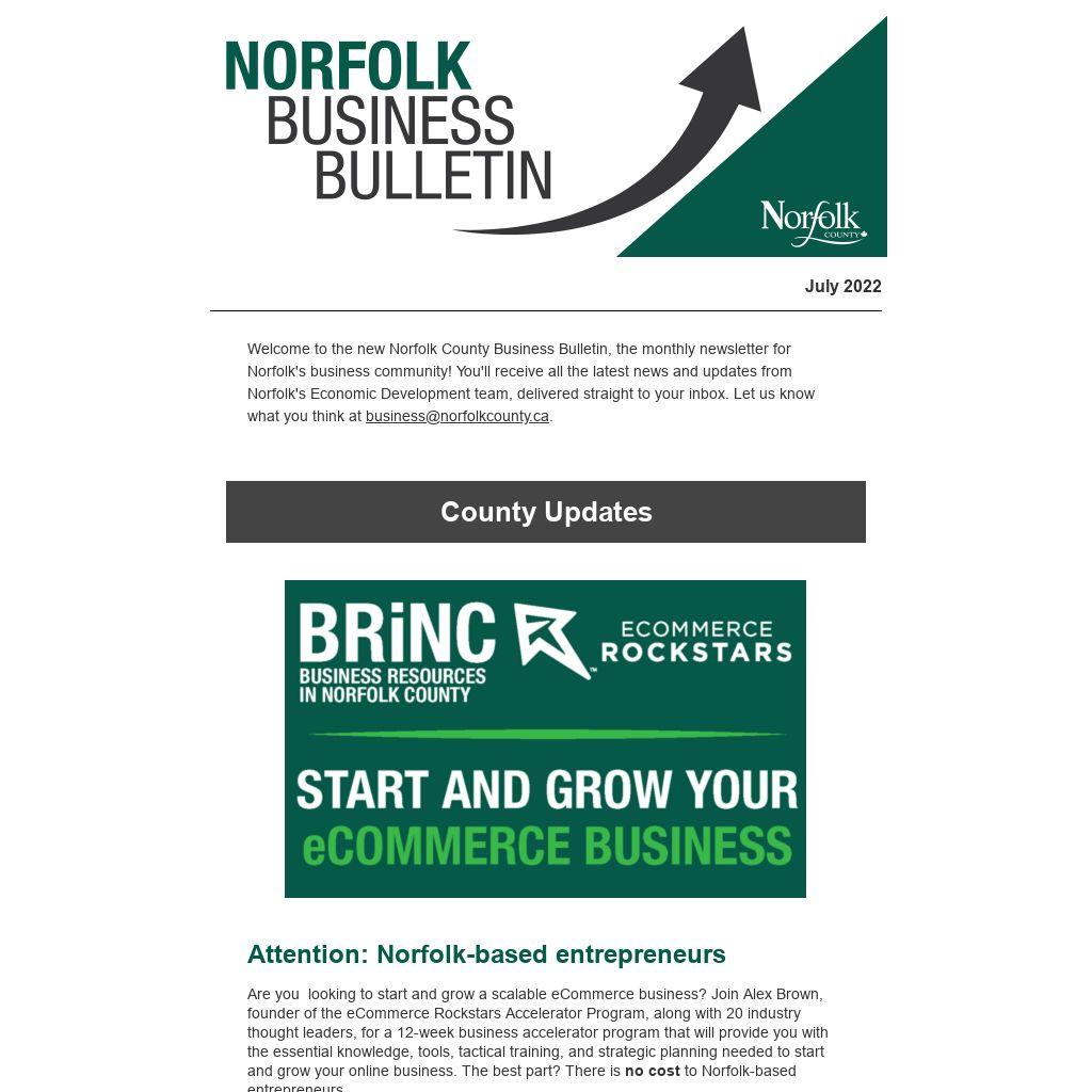 Welcome to the new Norfolk County Business Bulletin, the monthly newsletter for Norfolk's business community! You'll receive all the latest news and updates from Norfolk's Economic Development team, delivered straight to your inbox. Let us know what you think at business@norfolkcounty.ca.