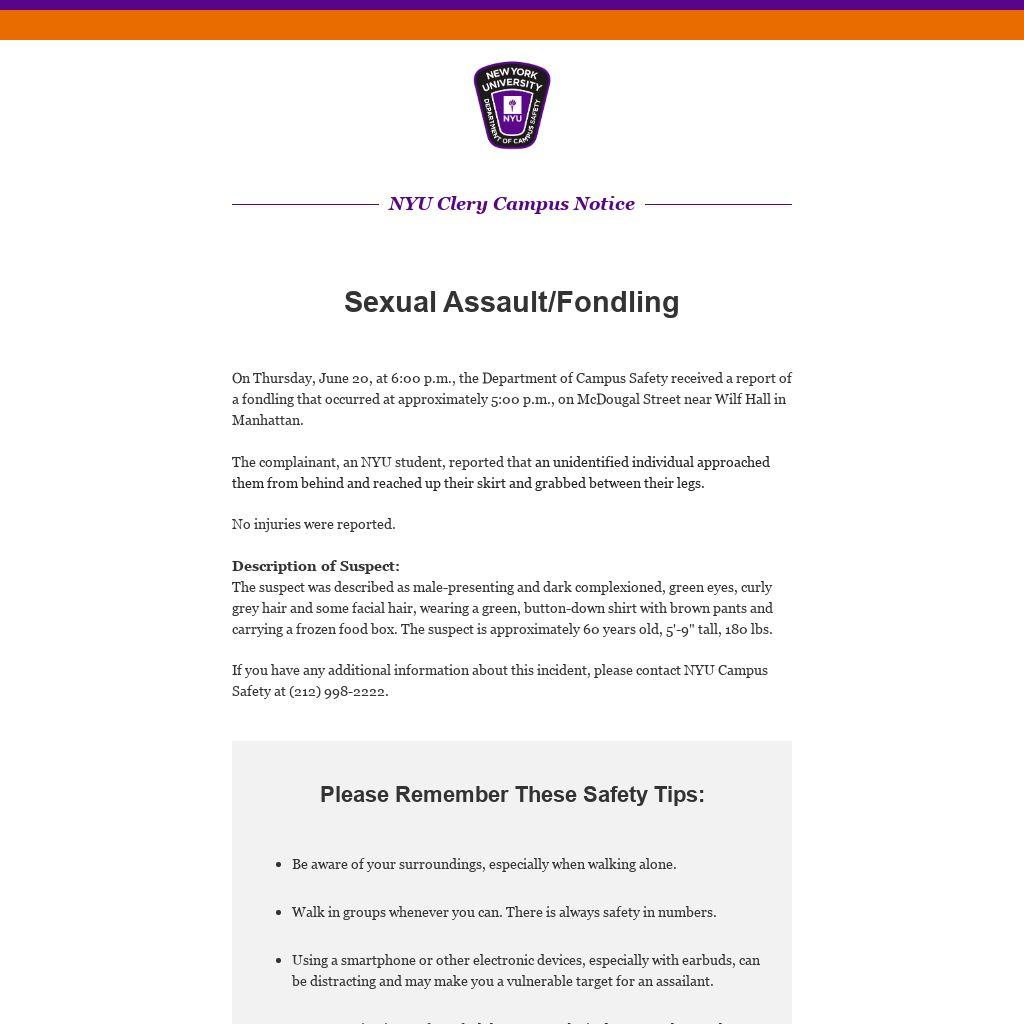 On Thursday, June 20, at 6:00 p.m., the Department of Campus Safety received a report of a fondling that occurred at approximately 5:00 p.m., on McDougal Street near Wilf Hall in Manhattan.