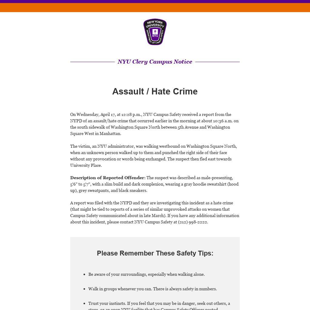 On Wednesday, April 17, at 12:28 p.m., NYU Campus Safety received a report from the NYPD of an assault/hate crime that occurred earlier in the morning at about 10:36 a.m. on the south sidewalk of Washington Square North between 5th Avenue and Washington Square West in Manhattan.