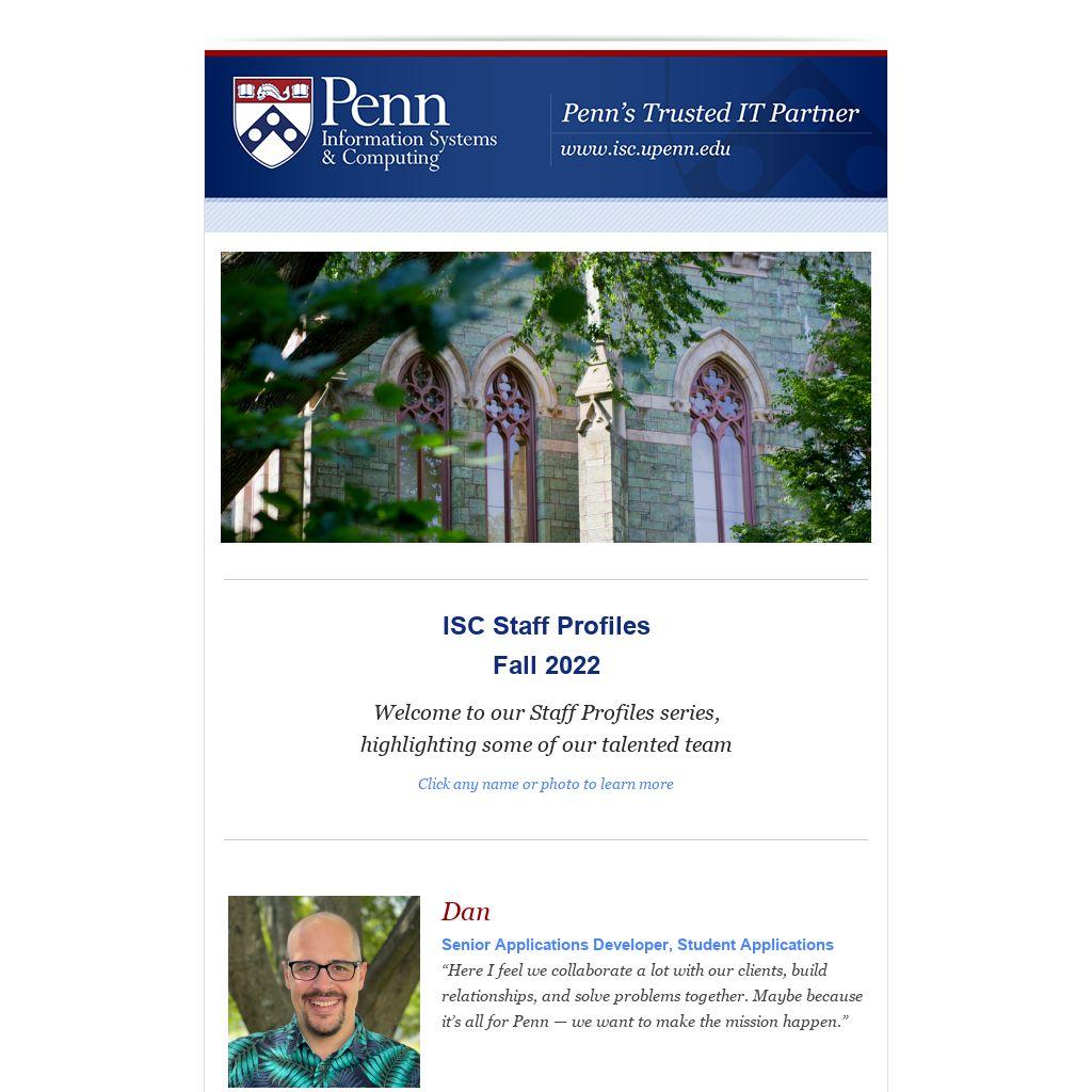 Dan Senior Applications Developer, Student Applications “Here I feel we collaborate a lot with our clients, build relationships, and solve problems together. Maybe because it’s all for Penn — we want to make the mission happen.”