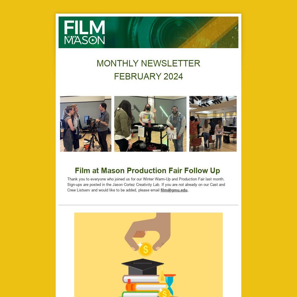 Thank you to everyone who joined us for our Winter Warm-Up and Production Fair last month. Sign-ups are posted in the Jason Cortez Creativity Lab. If you are not already on our Cast and Crew Listserv and would like to be added, please email film@gmu.edu.