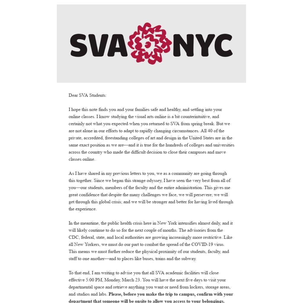 To that end, I am writing to advise you that all SVA academic facilities will close effective 5:00 PM, Monday, March 23. You will have the next five days to visit your departmental space and retrieve anything you want or need from lockers, storage areas, and studios and labs. Please, before you make the trip to campus, confirm with your department that someone will be onsite to allow you access to your belongings.