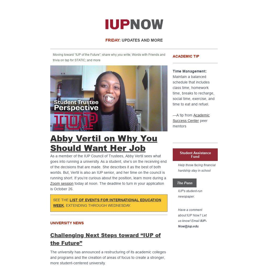 Distributed to IUP employees and students four days a week, IUP Now is the official newsletter of Indiana University of Pennsylvania. It features news from across the IUP website, compiled by the Division of Marketing and Communications. Find out how to get your news and events in IUP Now.