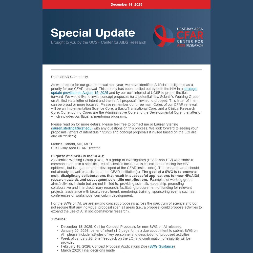 As we prepare for our grant renewal next year, we have identified Artificial Intelligence as a priority for our CFAR renewal. This priority has been spelled out by both the NIH in a strategic update provided on August 15, 2025 and by our own interest at UCSF to propel the field forward. We would like to invite concept proposals for a potential new Scientific Working Group on AI, first via a letter of intent and then a full proposal if invited to proceed. This letter of intent can be broad or more focused. Please remember our three main Cores of our CFAR renewal will be an Implementation Science Core, a Basic/Translational Core, and a Clinical Research Core. Our enduring Cores are the Administrative Core and the Developmental Core, the latter of which includes our flagship mentoring programs.