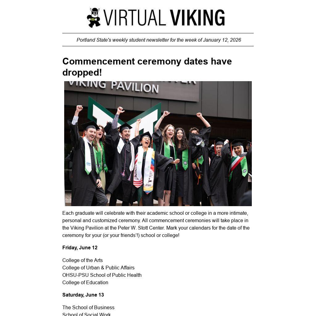 Virtual Viking is Portland State University's student newsletter, published weekly by University Communications. To submit a news item or event, email virtualv@pdx.edu.
