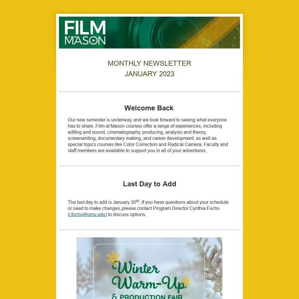 Start the semester off right by attending the Film at Mason Winter Warm-Up and Production Fair on Friday, February 3rd from 2:00-4:00pm in the MIX in Horizon Hall.