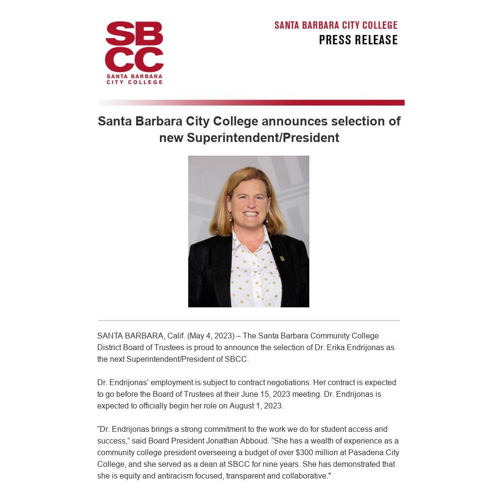 SANTA BARBARA, Calif. (May 4, 2023) – The Santa Barbara Community College District Board of Trustees is proud to announce the selection of Dr. Erika Endrijonas as the next Superintendent/President of SBCC.