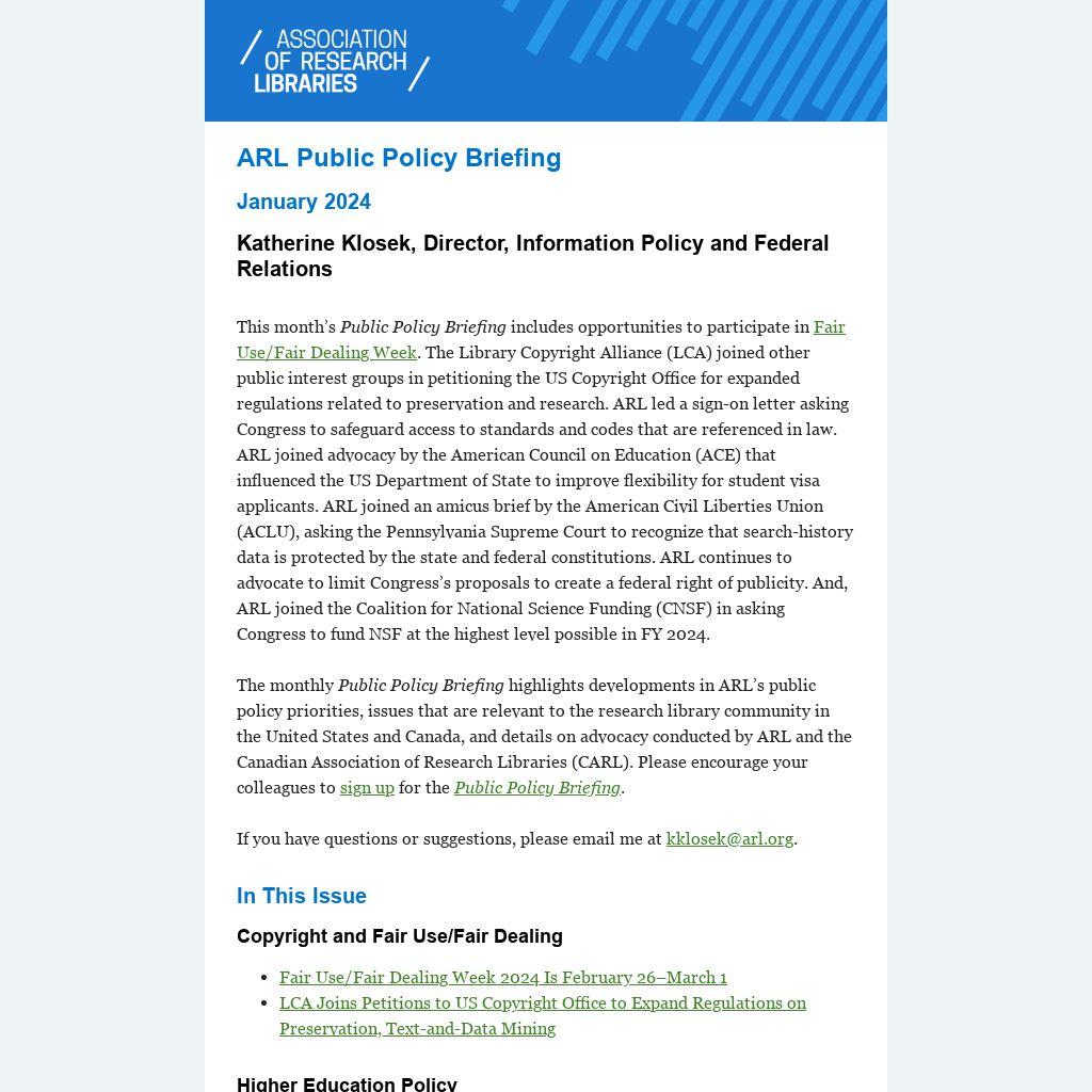 Public Policy Briefing includes opportunities to participate in Fair Use/Fair Dealing Week. The Library Copyright Alliance (LCA) joined other public interest groups in petitioning the US Copyright Office for expanded regulations related to preservation and research. ARL led a sign-on letter asking Congress to safeguard access to standards and codes that are referenced in law. ARL joined advocacy by the American Council on Education (ACE) that influenced the US Department of State to improve flexibility for student visa applicants. ARL joined an amicus brief by the American Civil Liberties Union (ACLU), asking the Pennsylvania Supreme Court to recognize that search-history data is protected by the state and federal constitutions. ARL continues to advocate to limit Congress’s proposals to create a federal right of publicity. And, ARL joined the Coalition for National Science Funding (CNSF) in asking Congress to fund NSF at the highest level possible in FY 2024.