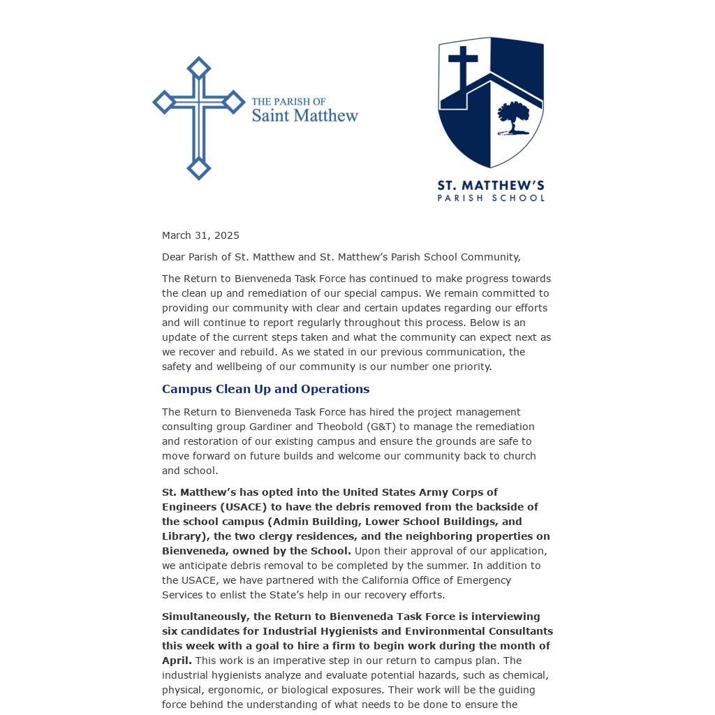 We will return to campus and continue to serve and love the St. Matthew’s Parish and School community as well as our Palisades neighbors. Thank you for your continued prayers and support.