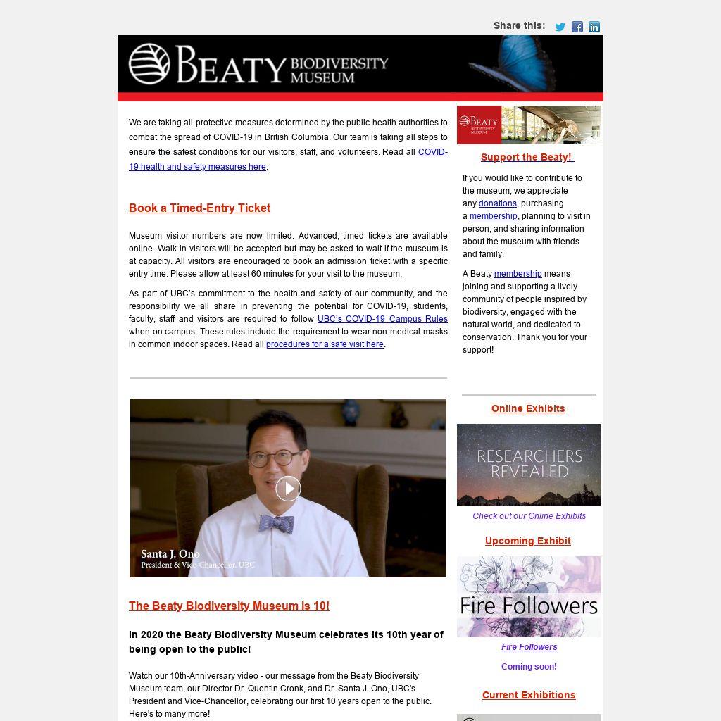 Watch our 10th-Anniversary video - our message from the Beaty Biodiversity Museum team, our Director Dr. Quentin Cronk, and Dr. Santa J. Ono, UBC's President and Vice-Chancellor, celebrating our first 10 years open to the public. Here's to many more!