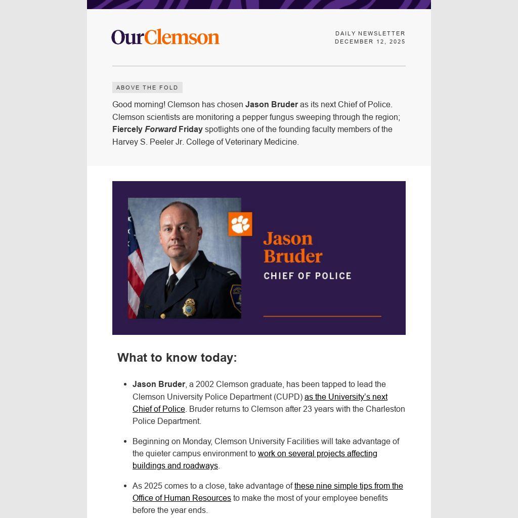 Good morning! Clemson has chosen Jason Bruder as its next Chief of Police. Clemson scientists are monitoring a pepper fungus sweeping through the region; Fiercely Forward Friday spotlights one of the founding faculty members of the Harvey S. Peeler Jr. College of Veterinary Medicine.