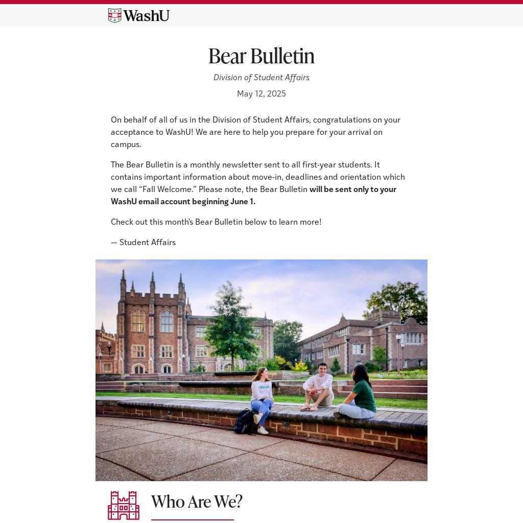 The Bear Bulletin is a monthly newsletter sent to all first-year students. It contains important information about move-in, deadlines and orientation which we call “Fall Welcome.” Please note, the Bear Bulletin will be sent only to your WashU email account beginning June 1.