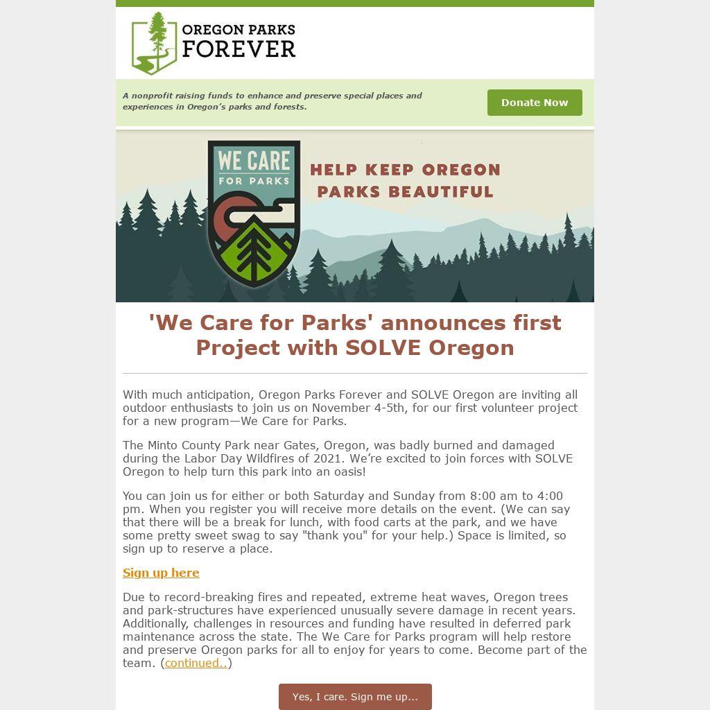 Due to record-breaking fires and repeated, extreme heat waves, Oregon trees and park-structures have experienced unusually severe damage in recent years. Additionally, challenges in resources and funding have resulted in deferred park maintenance across the state. The We Care for Parks program will help restore and preserve Oregon parks for all to enjoy for years to come. Become part of the team. (continued..)