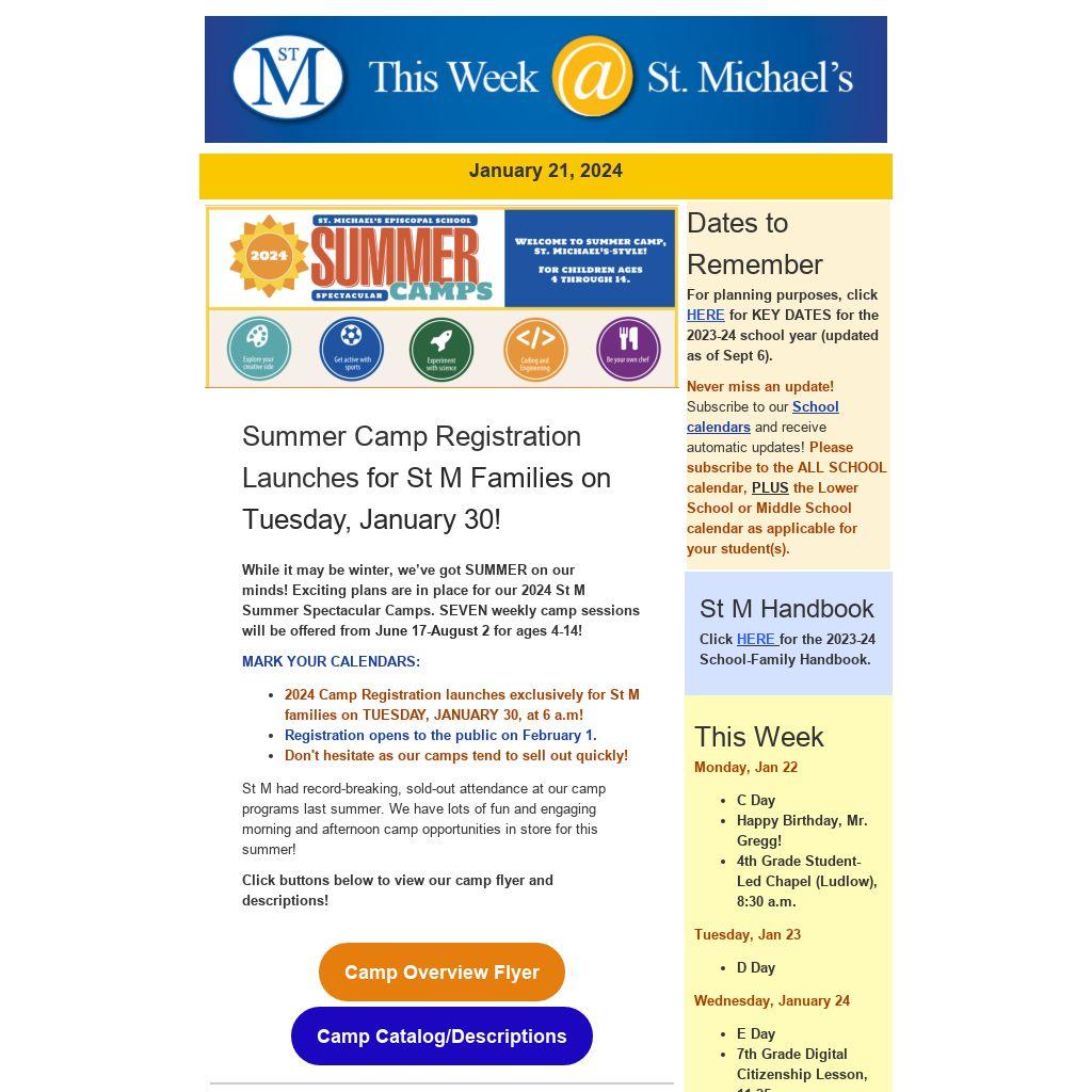 - 2024 Camp Registration launches exclusively for St M families on TUESDAY, JANUARY 30, at 6 a.m!