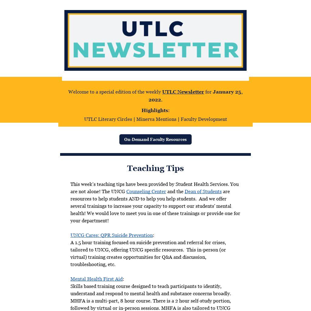 This week’s teaching tips have been provided by Student Health Services. You are not alone! The UNCG Counseling Center and the Dean of Students are resources to help students AND to help you help students. And we offer several trainings to increase your capacity to support our students' mental health! We would love to meet you in one of these trainings or provide one for your department!