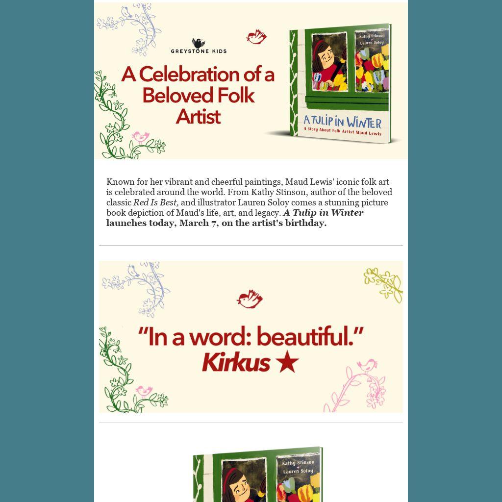 Known for her vibrant and cheerful paintings, Maud Lewis' iconic folk art is celebrated around the world. From Kathy Stinson, author of the beloved classic Red Is Best, and illustrator Lauren Soloy comes a stunning picture book depiction of Maud's life, art, and legacy. A Tulip in Winter launches today, March 7, on the artist's birthday. |
