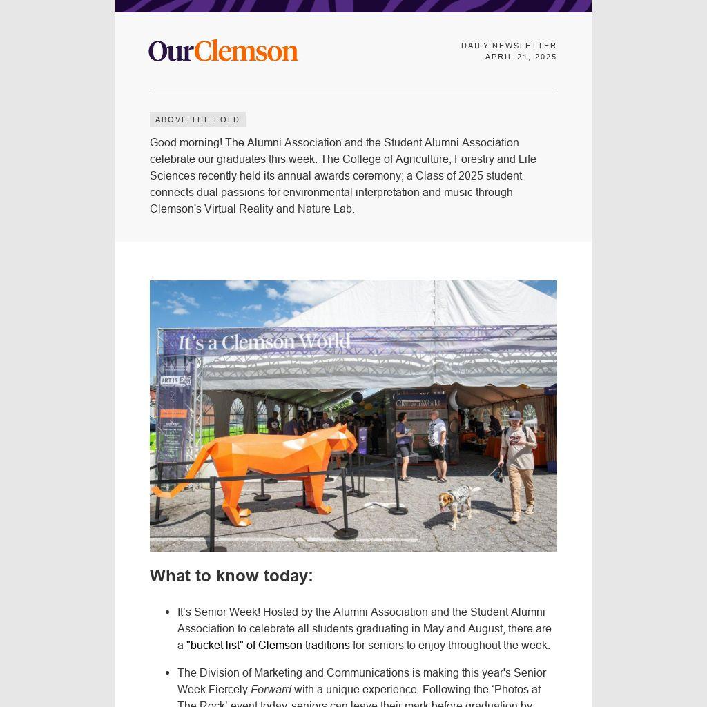 Good morning! The Alumni Association and the Student Alumni Association celebrate our graduates this week. The College of Agriculture, Forestry and Life Sciences recently held its annual awards ceremony; a Class of 2025 student connects dual passions for environmental interpretation and music through Clemson's Virtual Reality and Nature Lab.