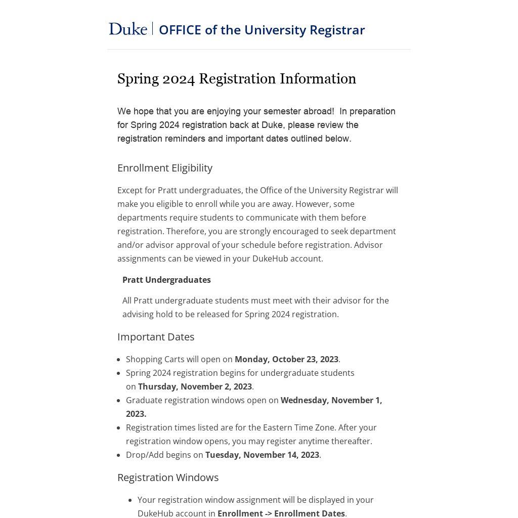 We hope that you are enjoying your semester abroad! In preparation for Spring 2024 registration back at Duke, please review the registration reminders and important dates outlined below.