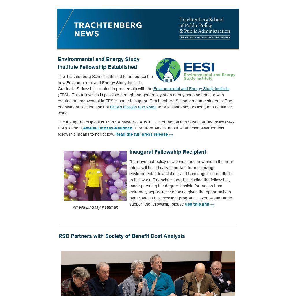 The Trachtenberg School is thrilled to announce the new Environmental and Energy Study Institute Graduate Fellowship created in partnership with the Environmental and Energy Study Institute (EESI). This fellowship is possible through the generosity of an anonymous benefactor who created an endowment in EESI’s name to support Trachtenberg School graduate students. The endowment is in the spirit of EESI’s mission and vision for a sustainable, resilient, and equitable world.