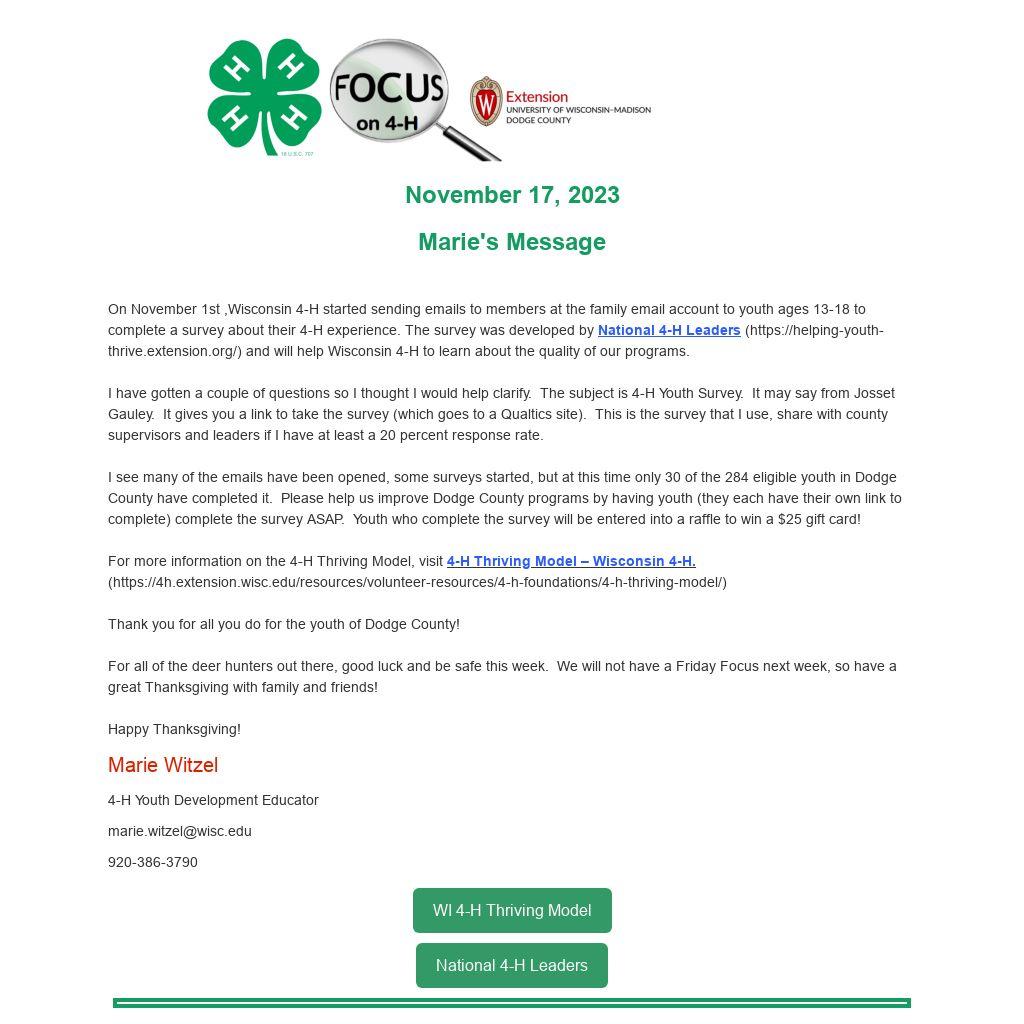 For more information on the 4-H Thriving Model, visit 4-H Thriving Model – Wisconsin 4-H. (https://4h.extension.wisc.edu/resources/volunteer-resources/4-h-foundations/4-h-thriving-model/) Thank you for all you do for the youth of Dodge County! For all of the deer hunters out there, good luck and be safe this week. We will not have a Friday Focus next week, so have a great Thanksgiving with family and friends! Happy Thanksgiving!