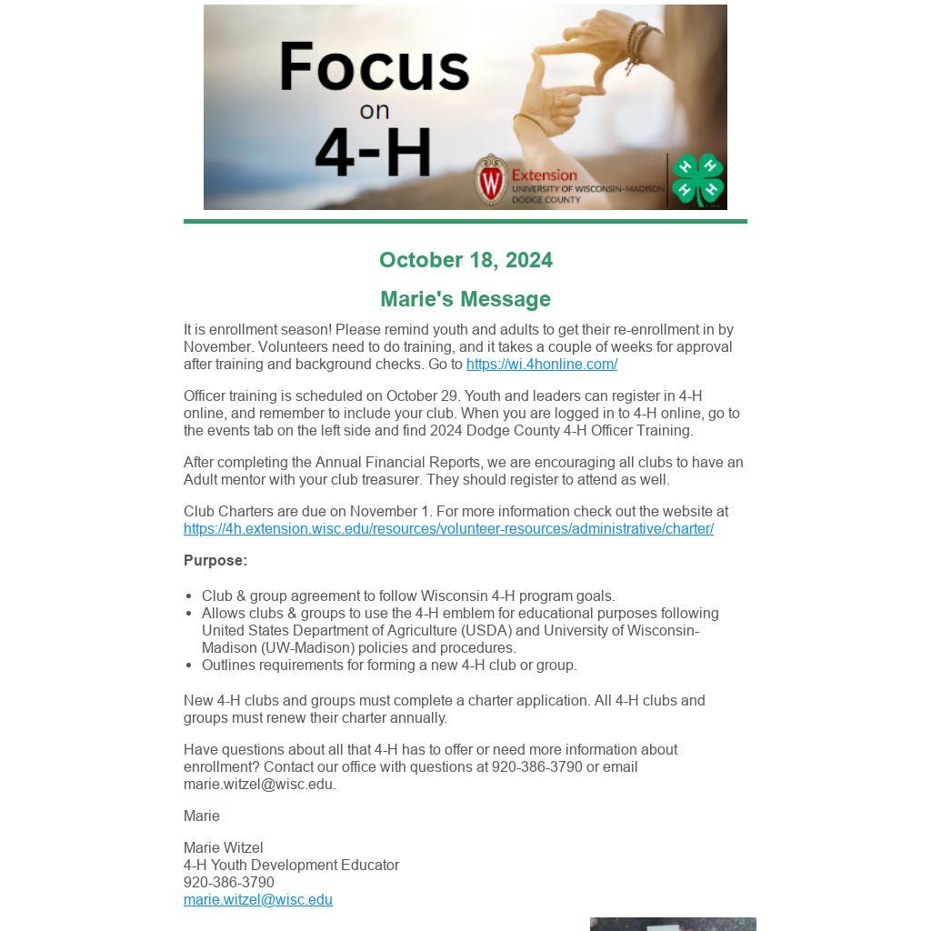 Have questions about all that 4-H has to offer or need more information about enrollment? Contact our office with questions at 920-386-3790 or email marie.witzel@wisc.edu.