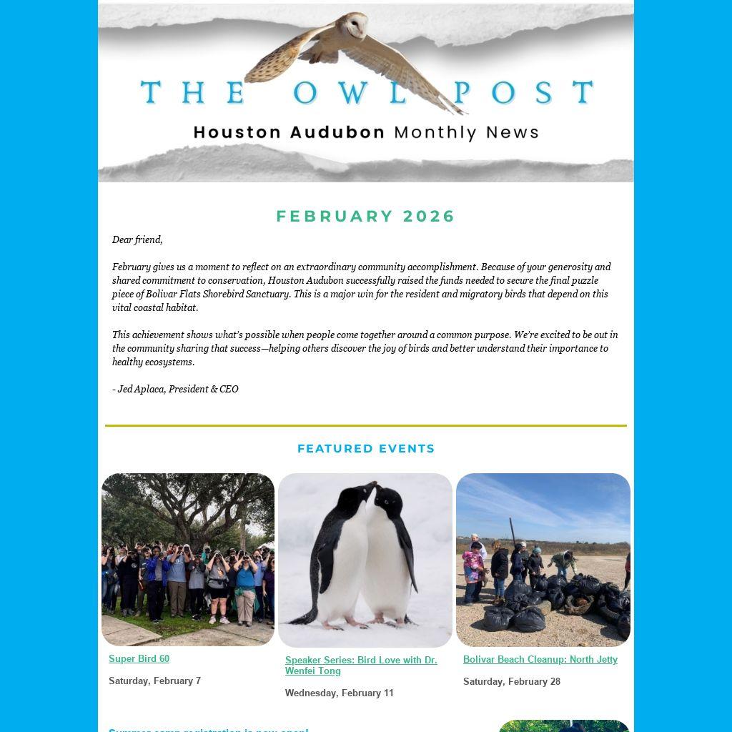February gives us a moment to reflect on an extraordinary community accomplishment. Because of your generosity and shared commitment to conservation, Houston Audubon successfully raised the funds needed to secure the final puzzle piece of Bolivar Flats Shorebird Sanctuary. This is a major win for the resident and migratory birds that depend on this vital coastal habitat.