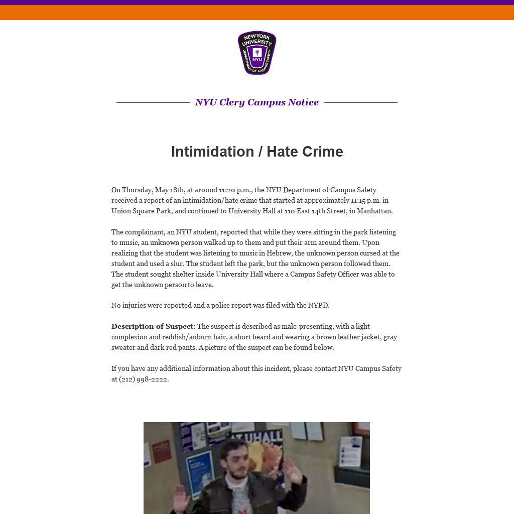 On Thursday, May 18th, at around 11:20 p.m., the NYU Department of Campus Safety received a report of an intimidation/hate crime that started at approximately 11:15 p.m. in Union Square Park, and continued to University Hall at 110 East 14th Street, in Manhattan.