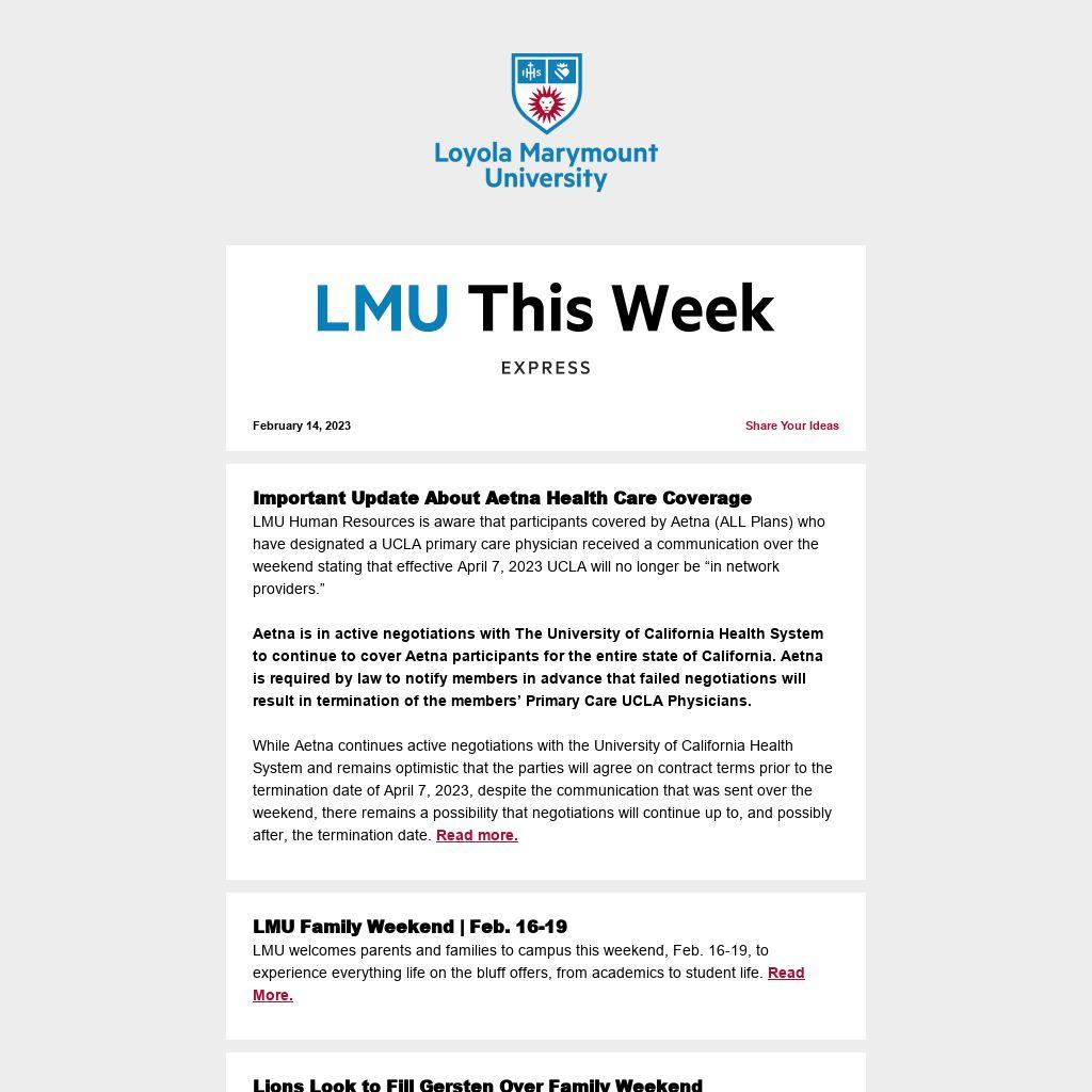 LMU Human Resources is aware that participants covered by Aetna (ALL Plans) who have designated a UCLA primary care physician received a communication over the weekend stating that effective April 7, 2023 UCLA will no longer be “in network providers.”