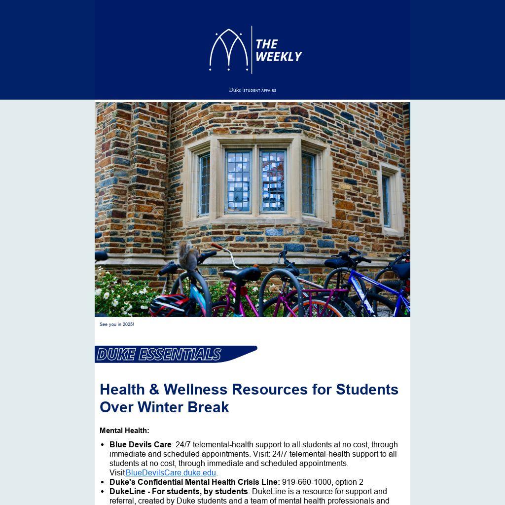 Blue Devils Care: 24/7 telemental-health support to all students at no cost, through immediate and scheduled appointments. Visit: 24/7 telemental-health support to all students at no cost, through immediate and scheduled appointments. Visit BlueDevilsCare.duke.edu.