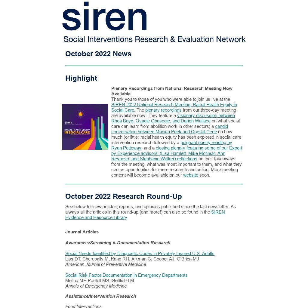 You are receiving this email because either you signed up to receive updates from SIREN or we feel that your work aligns well with SIREN and that the resources we provide will be of use to you. If you no longer wish to receive emails from SIREN please unsubscribe by clicking the link below.