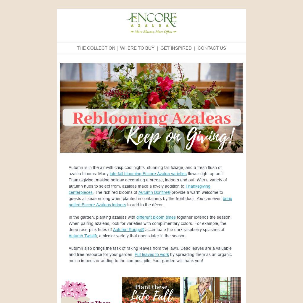 Autumn is in the air with crisp cool nights, stunning fall foliage, and a fresh flush of azalea blooms. Many late fall blooming Encore Azalea varieties flower right up until Thanksgiving, making holiday decorating a breeze, indoors and out. With a variety of autumn hues to select from, azaleas make a lovely addition to Thanksgiving centerpieces. The rich red blooms of Autumn Bonfire® provide a warm welcome to guests all season long when planted in containers by the front door. You can even bring potted Encore Azaleas indoors to add to the décor.