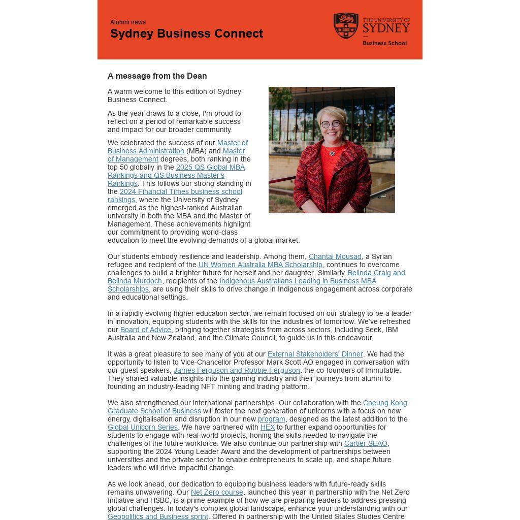 2024 Financial Times business school rankings, where the University of Sydney emerged as the highest-ranked Australian university in both the MBA and the Master of Management. These achievements highlight our commitment to providing world-class education to meet the evolving demands of a global market.