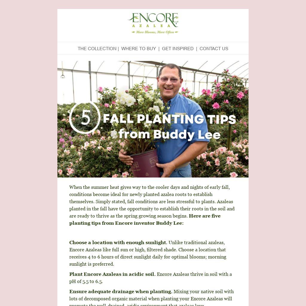 When the summer heat gives way to the cooler days and nights of early fall, conditions become ideal for newly planted azalea roots to establish themselves. Simply stated, fall conditions are less stressful to plants. Azaleas planted in the fall have the opportunity to establish their roots in the soil and are ready to thrive as the spring growing season begins. Here are five planting tips from Encore inventor Buddy Lee: