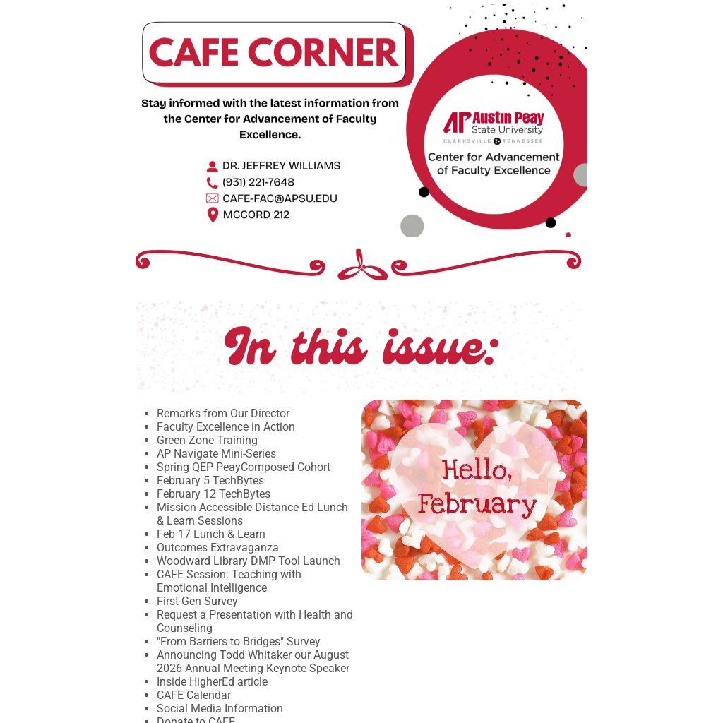 As always, I welcome your ideas on how CAFE can better serve you. Please don't hesitate to reach out at williamsjj@apsu.edu or 931-221-7648.
