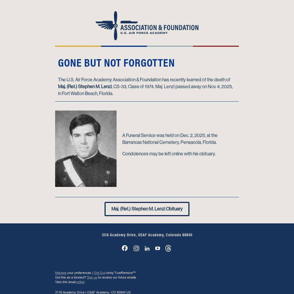 The U.S. Air Force Academy Association & Foundation has recently learned of the death of Maj. (Ret.) Stephen M. Lenzi, CS-33, Class of 1974. Maj. Lenzi passed away on Nov. 4, 2025, in Fort Walton Beach, Florida.