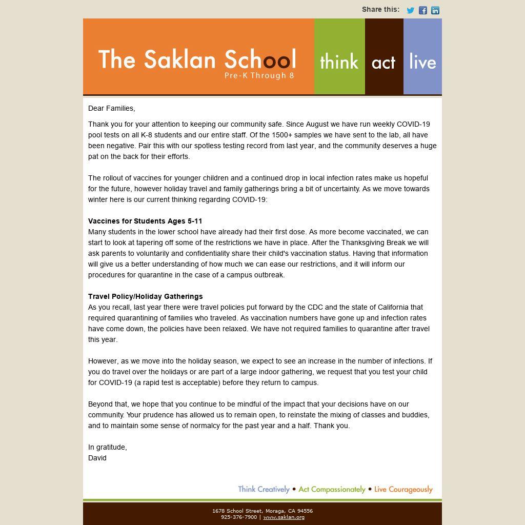 Beyond that, we hope that you continue to be mindful of the impact that your decisions have on our community. Your prudence has allowed us to remain open, to reinstate the mixing of classes and buddies, and to maintain some sense of normalcy for the past year and a half. Thank you.