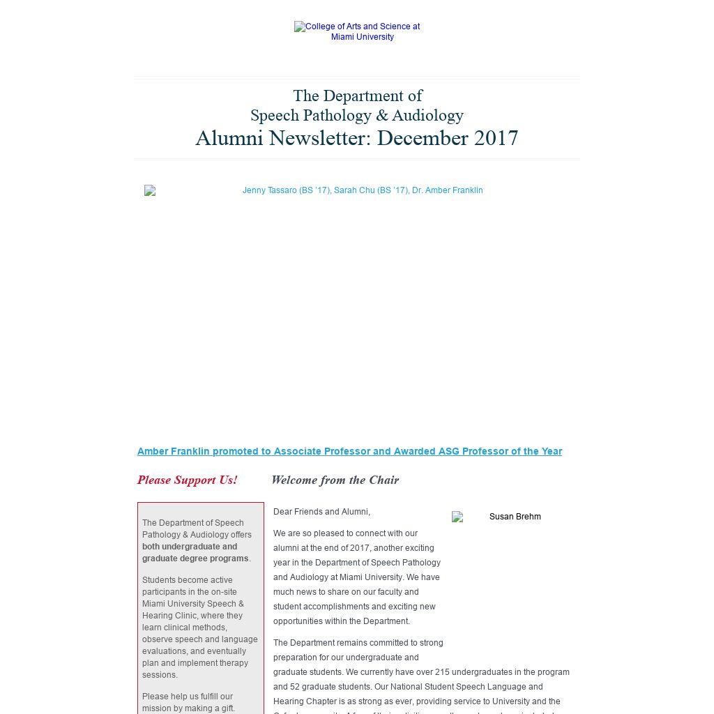 We are so pleased to connect with our alumni at the end of 2017, another exciting year in the Department of Speech Pathology and Audiology at Miami University. We have much news to share on our faculty and student accomplishments and exciting new opportunities within the Department.