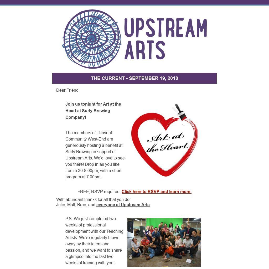 The members of Thrivent Community West-End are generously hosting a benefit at Surly Brewing in support of Upstream Arts. We'd love to see you there! Drop in as you like from 5:30-8:00pm, with a short program at 7:00pm.