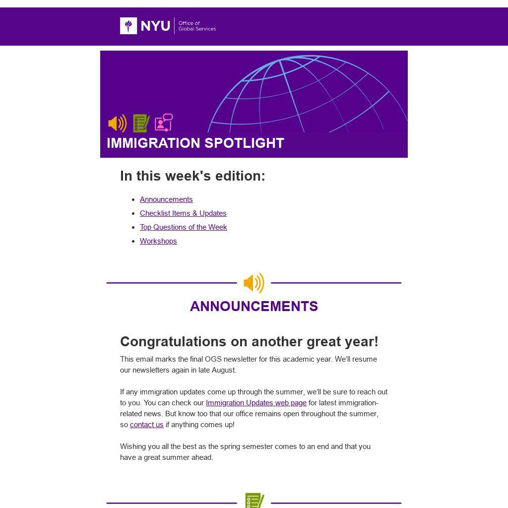 Last Newsletter of the Year, Summer Reminders, OPT and Visa Workshops