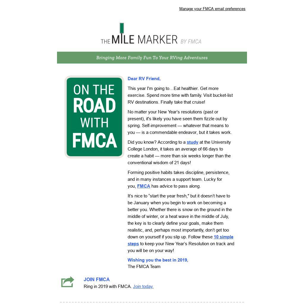 This year I'm going to…Eat healthier. Get more exercise. Spend more time with family. Visit bucket-list RV destinations. Finally take that cruise! No matter your New Year’s resolutions (past or present), it's likely you have seen them fizzle out by spring. Self-improvement — whatever that means to you — is a commendable endeavor, but it takes work. Did you know? According to a study at the University College London, it takes an average of 66 days to create a habit — more than six weeks longer than the conventional wisdom of 21 days! Forming positive habits takes discipline, persistence, and in many instances a support team. Lucky for you, FMCA has advice to pass along. It’s nice to “start the year fresh," but it doesn’t have to be January when you begin to work on becoming a better you. Whether there is snow on the ground in the middle of winter, or a heat wave in the middle of July, the key is to clearly define your goals, make them realistic, and, perhaps most importantly, don’t get too down on yourself if you slip up. Follow these 10 simple steps to keep your New Year’s Resolution on track and you will be on your way!