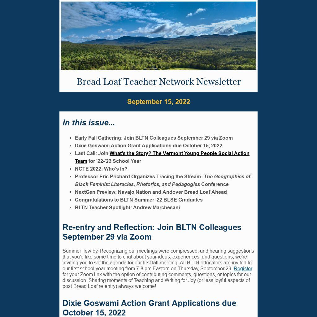 Summer flew by. Recognizing our meetings were compressed, and hearing suggestions that you'd like some time to chat about your ideas, experiences, and questions, we're inviting you to set the agenda for our first fall meeting. All BLTN educators are invited to our first school year meeting from 7-8 pm Eastern on Thursday, September 29. Register for your Zoom link with the option of contributing comments, questions, or topics for our discussion. Sharing moments of Teaching and Writing for Joy (or less joyful aspects of post-Bread Loaf re-entry) always welcome!