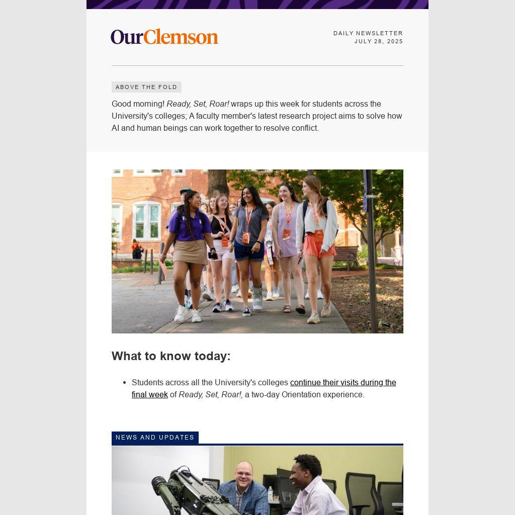 Good morning! Ready, Set, Roar! wraps up this week for students across the University's colleges; A faculty member's latest research project aims to solve how AI and human beings can work together to resolve conflict.