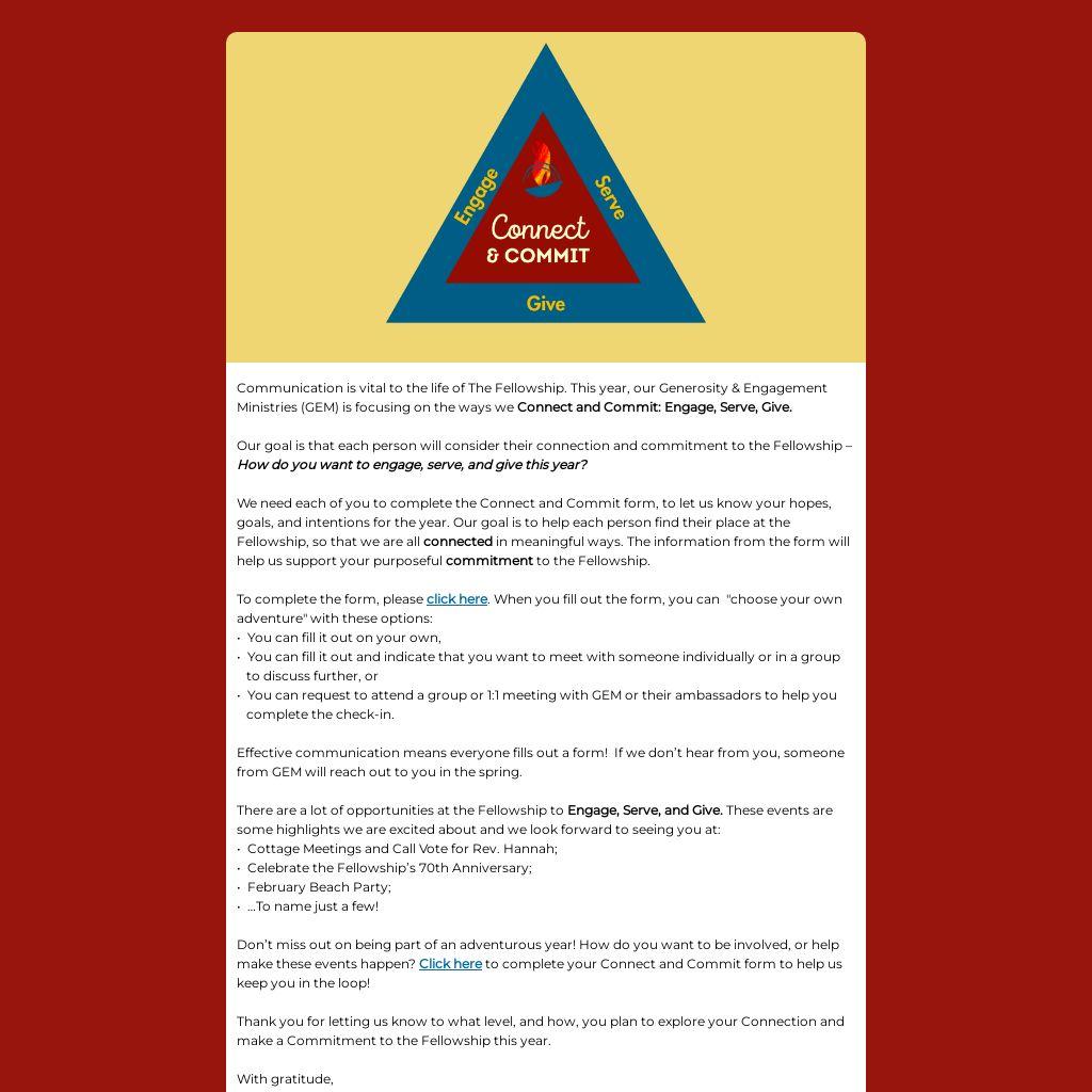 Communication is vital to the life of The Fellowship. This year, our Generosity & Engagement Ministries (GEM) is focusing on the ways we Connect and Commit: Engage, Serve, Give.