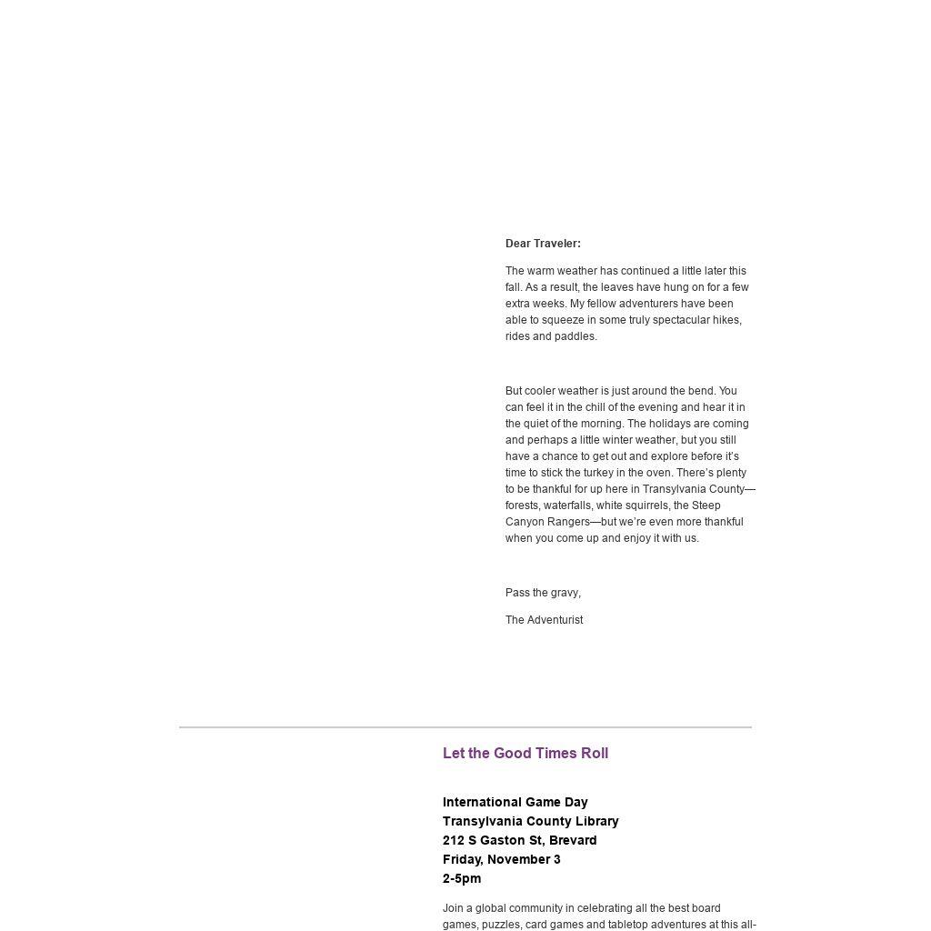 But cooler weather is just around the bend. You can feel it in the chill of the evening and hear it in the quiet of the morning. The holidays are coming and perhaps a little winter weather, but you still have a chance to get out and explore before it’s time to stick the turkey in the oven. There’s plenty to be thankful for up here in Transylvania County—forests, waterfalls, white squirrels, the Steep Canyon Rangers—but we’re even more thankful when you come up and enjoy it with us.