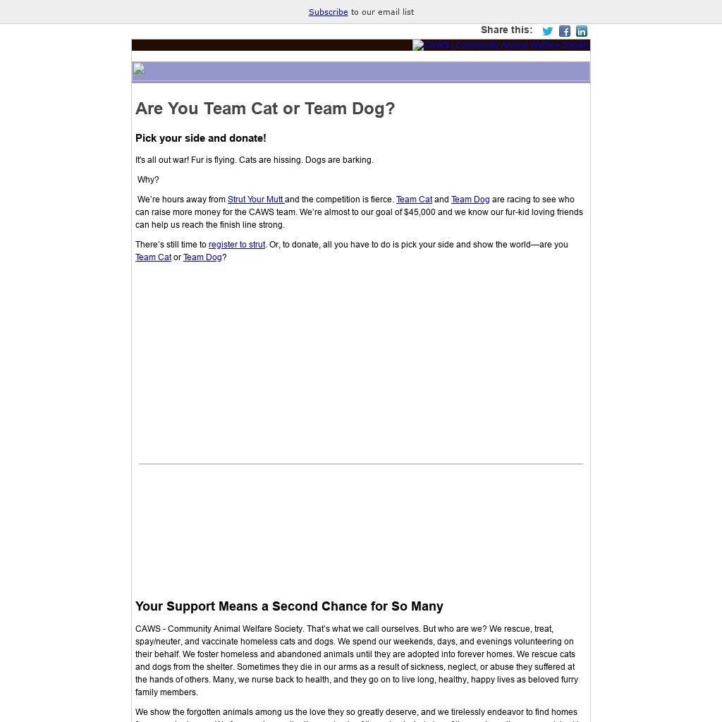 CAWS - Community Animal Welfare Society. That’s what we call ourselves. But who are we? We rescue, treat, spay/neuter, and vaccinate homeless cats and dogs. We spend our weekends, days, and evenings volunteering on their behalf. We foster homeless and abandoned animals until they are adopted into forever homes. We rescue cats and dogs from the shelter. Sometimes they die in our arms as a result of sickness, neglect, or abuse they suffered at the hands of others. Many, we nurse back to health, and they go on to live long, healthy, happy lives as beloved furry family members.