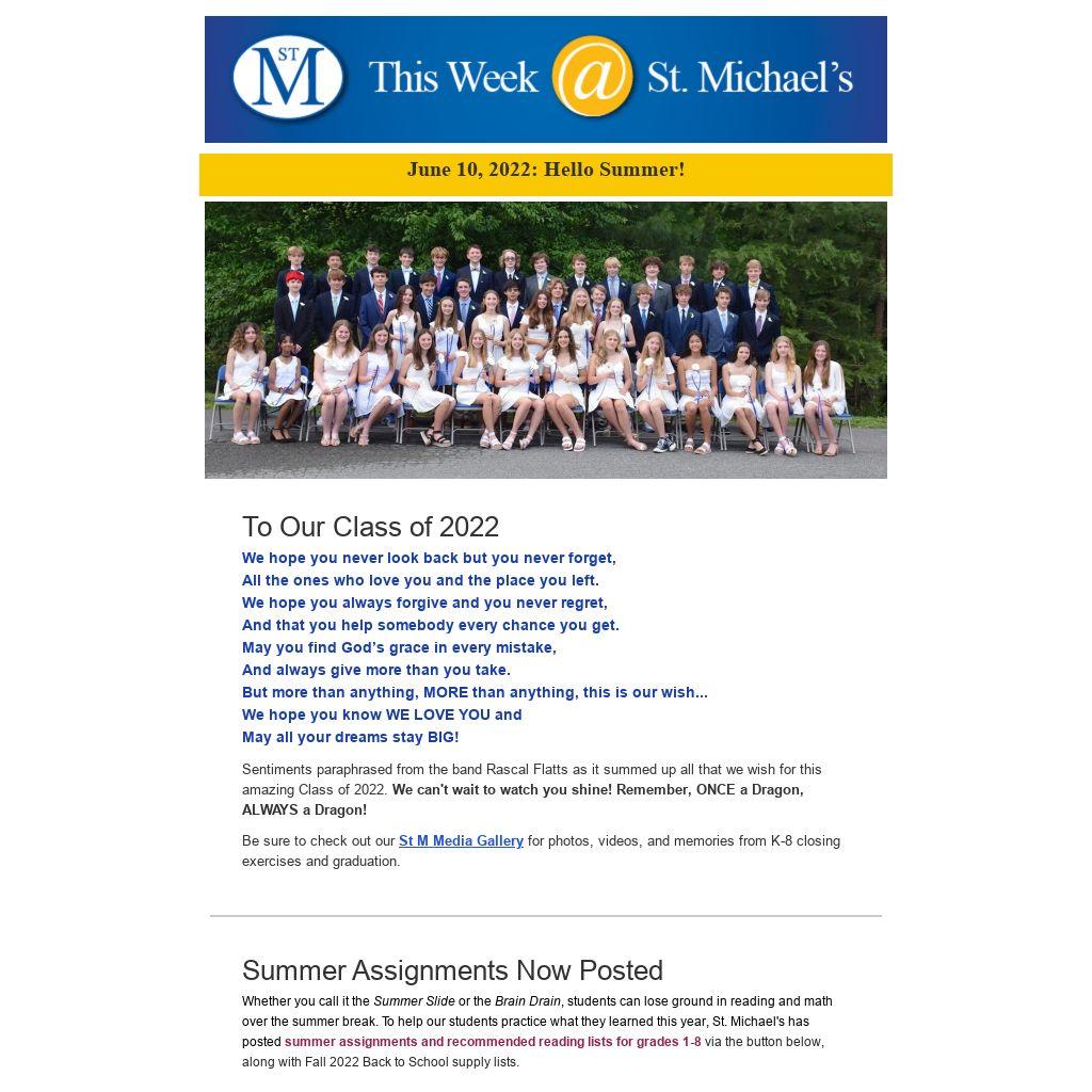 All St. Michael's Health Forms and Back to School forms will go live for the '22-'23 school year on MONDAY, JUNE 27. Following the release of forms in the school database on June 27, you will be able to complete forms through the PowerSchool Parent Account that you have created. An email will go out to all St. Michael's families the week of June 20th with detailed instructions for locating the necessary forms within your PowerSchool Parent Account.