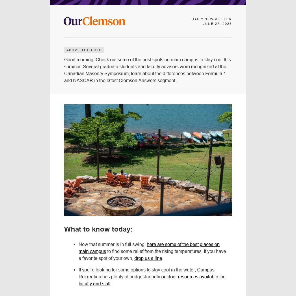 Good morning! Check out some of the best spots on main campus to stay cool this summer. Several graduate students and faculty advisors were recognized at the Canadian Masonry Symposium; learn about the differences between Formula 1 and NASCAR in the latest Clemson Answers segment.