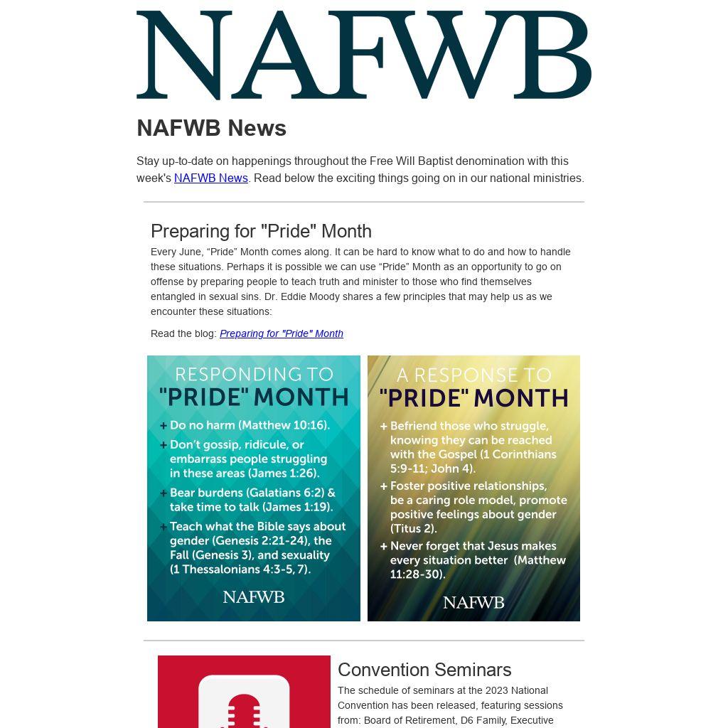 The schedule of seminars at the 2023 National Convention has been released, featuring sessions from: Board of Retirement, D6 Family, Executive Office, IM, Inc., North American Ministries, Welch College, WNAC, Commission for Theological Integrity, Historical Commission, Media Commission, Music Commission, and the Committee on Denominational Research.