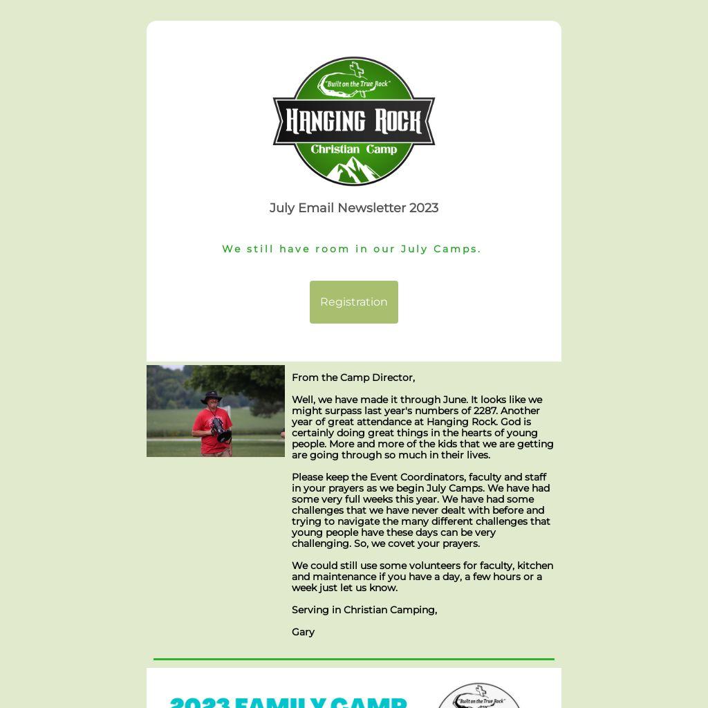 Well, we have made it through June. It looks like we might surpass last year's numbers of 2287. Another year of great attendance at Hanging Rock. God is certainly doing great things in the hearts of young people. More and more of the kids that we are getting are going through so much in their lives.