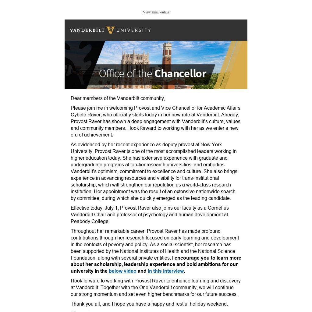 Effective today, July 1, Provost Raver also joins our faculty as a Cornelius Vanderbilt Chair and professor of psychology and human development at Peabody College.
